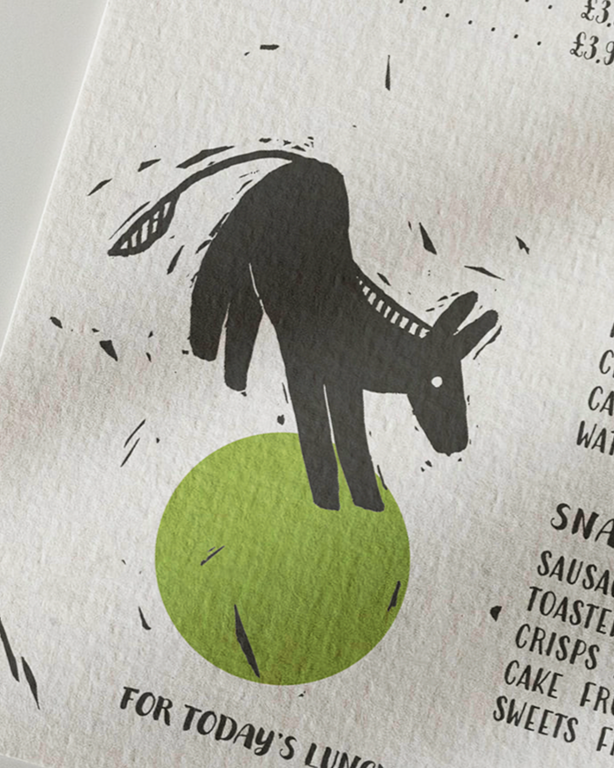 Illustration and graphic design for the new menu of the Home of Rest for Old Horses, based on the Isle of Man, United Kingdom. The visual identity is inspired by traditional linocut techniques, a printmaking process known for its bold lines, tactile texture, and handcrafted feel.